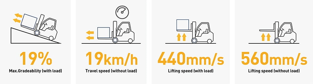 ● 更快的行驶速度、起升以及下降速度,大大提高了生产效率。
